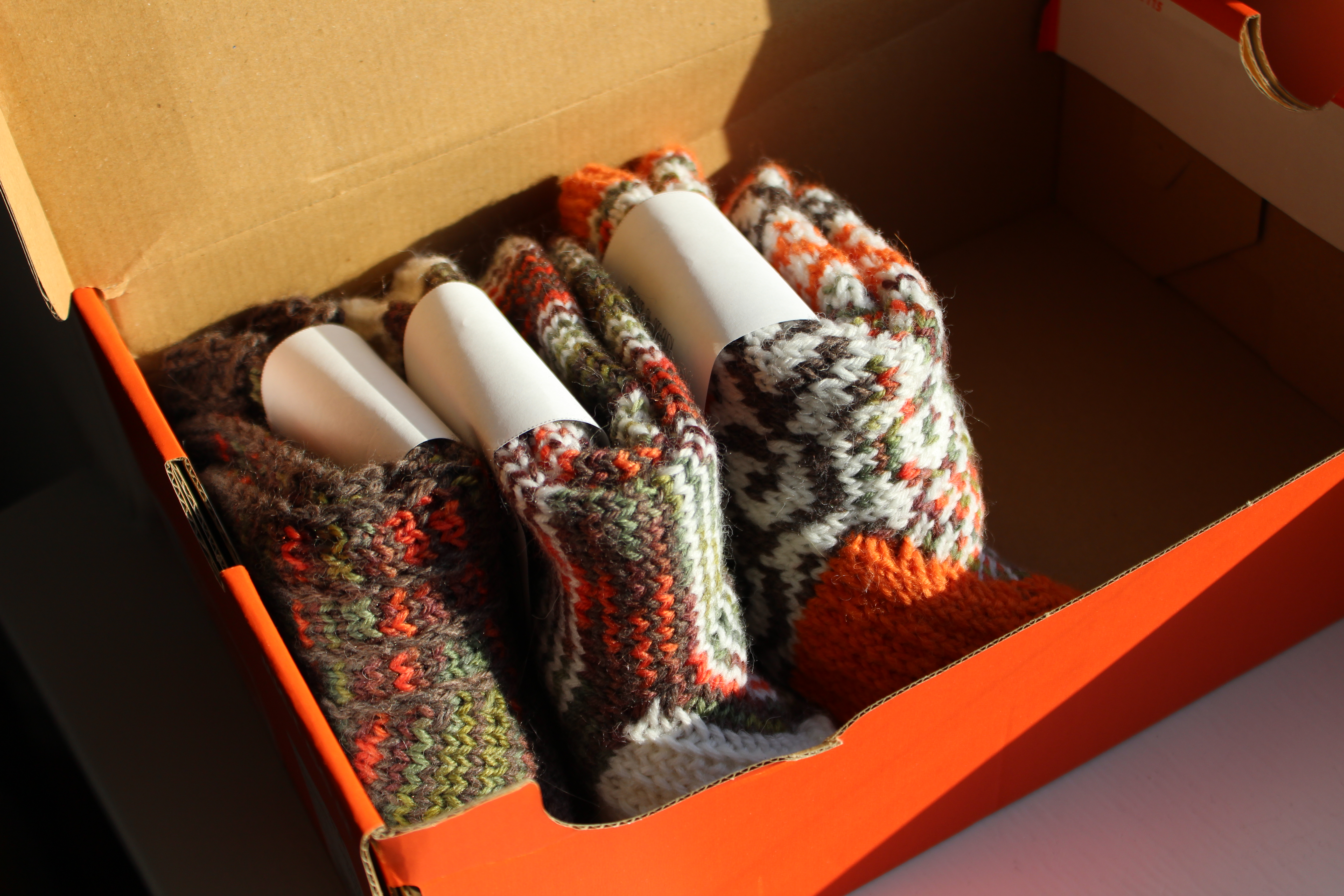 Nytpä sattui erikoisesti, kun en ole maaliskuussa saanut valmiiksi kuin yhden sukkaparin (Saippuakuplasukat)! Mutta sukkalaatikossa on nyt kuitenkin kolme paria sukkia, joten olen ihan aikataulussa sen suhteen. Valitsin säilytykseen oranssin kenkälaatikon, kun kaikki kolme sukkaparia tähän saakka ovat hyvin oranssipainotteisia. Vielä mietin, jatkanko samalla teemalla seuraavatkin sukat vai tekisinkö väliin jotkut muut, esimerkiksi jämälankasukat tai ihan yksiväriset, mutta en ole vielä päättänyt.